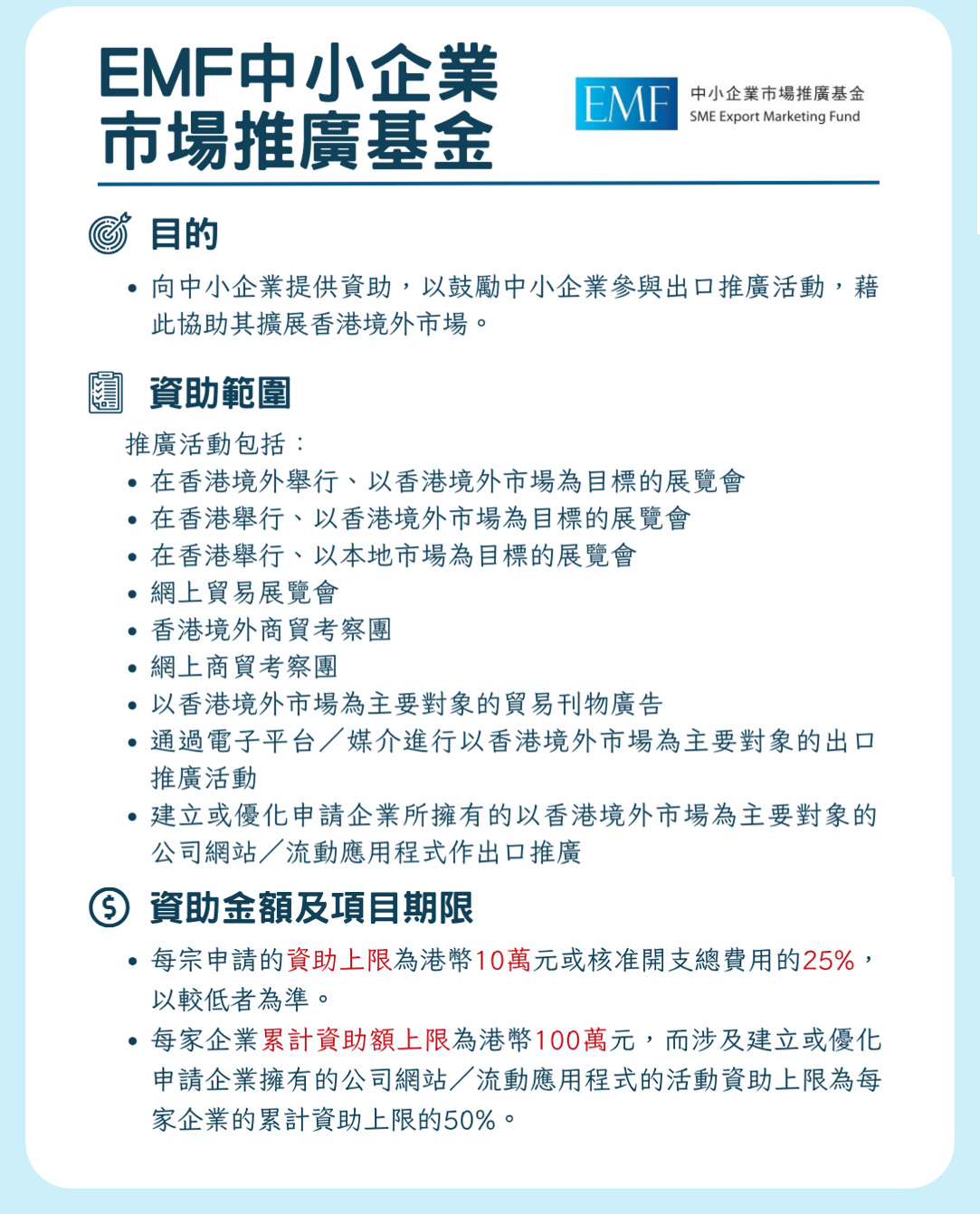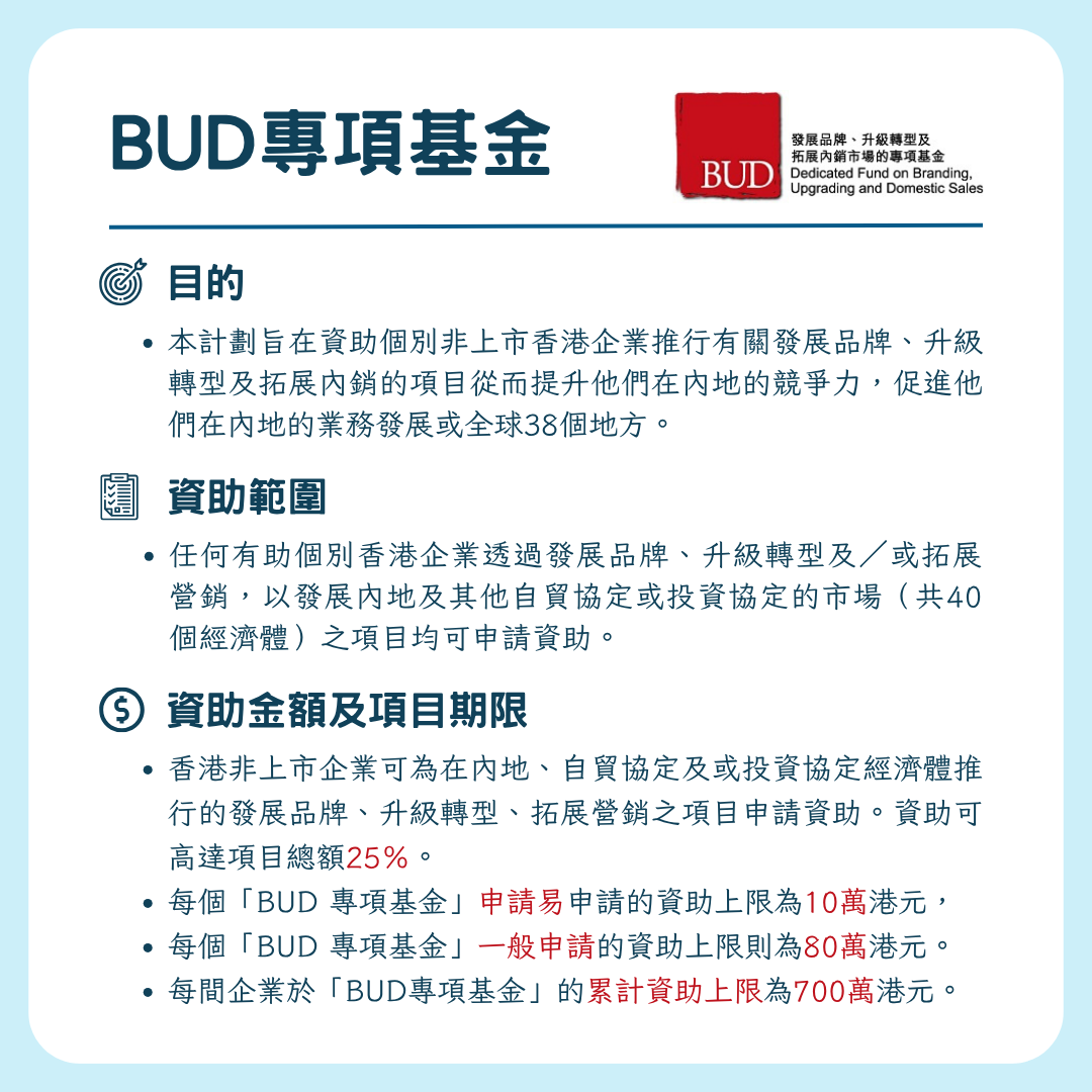 (備註:基金由前「中小企業發展支援基金」及「發展品牌、升級轉型及拓展內銷市場的專項基金」(BUD 專項基金)下的機構支援計劃整合而成。)